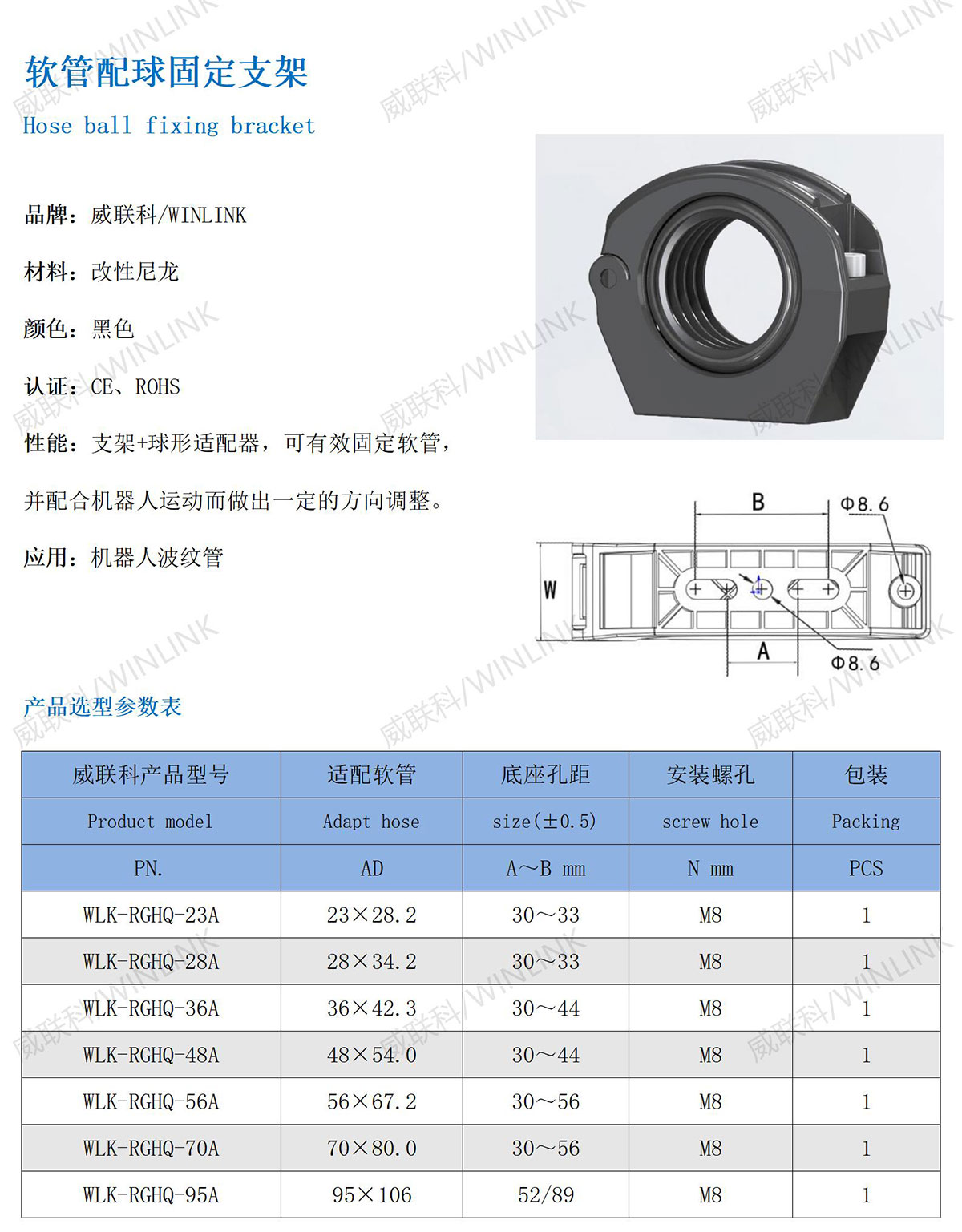 性能:支架+球形适配器,可有效固定软管,并配合机器人运动而做出一定的方向调整。