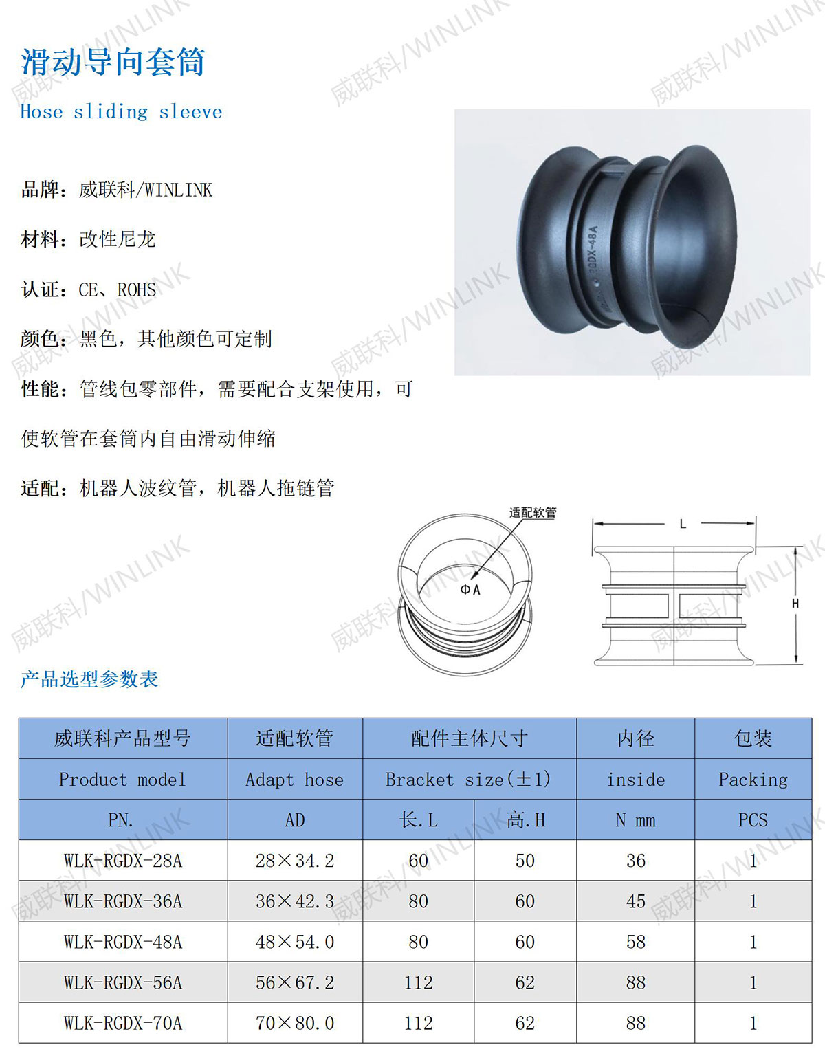 性能:管线包零部件,需要配合支架使用,可使软管在套筒内自由滑动伸缩