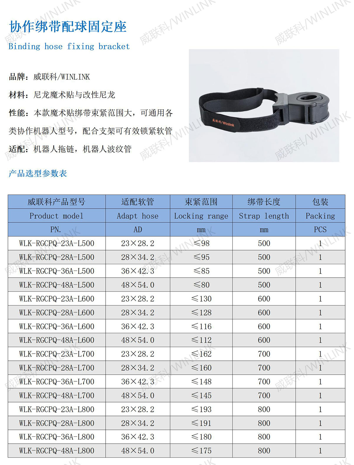 性能:本款魔术贴绑带束紧范围大,可通用各类协作机器人型号,配合支架可有效锁紧软管