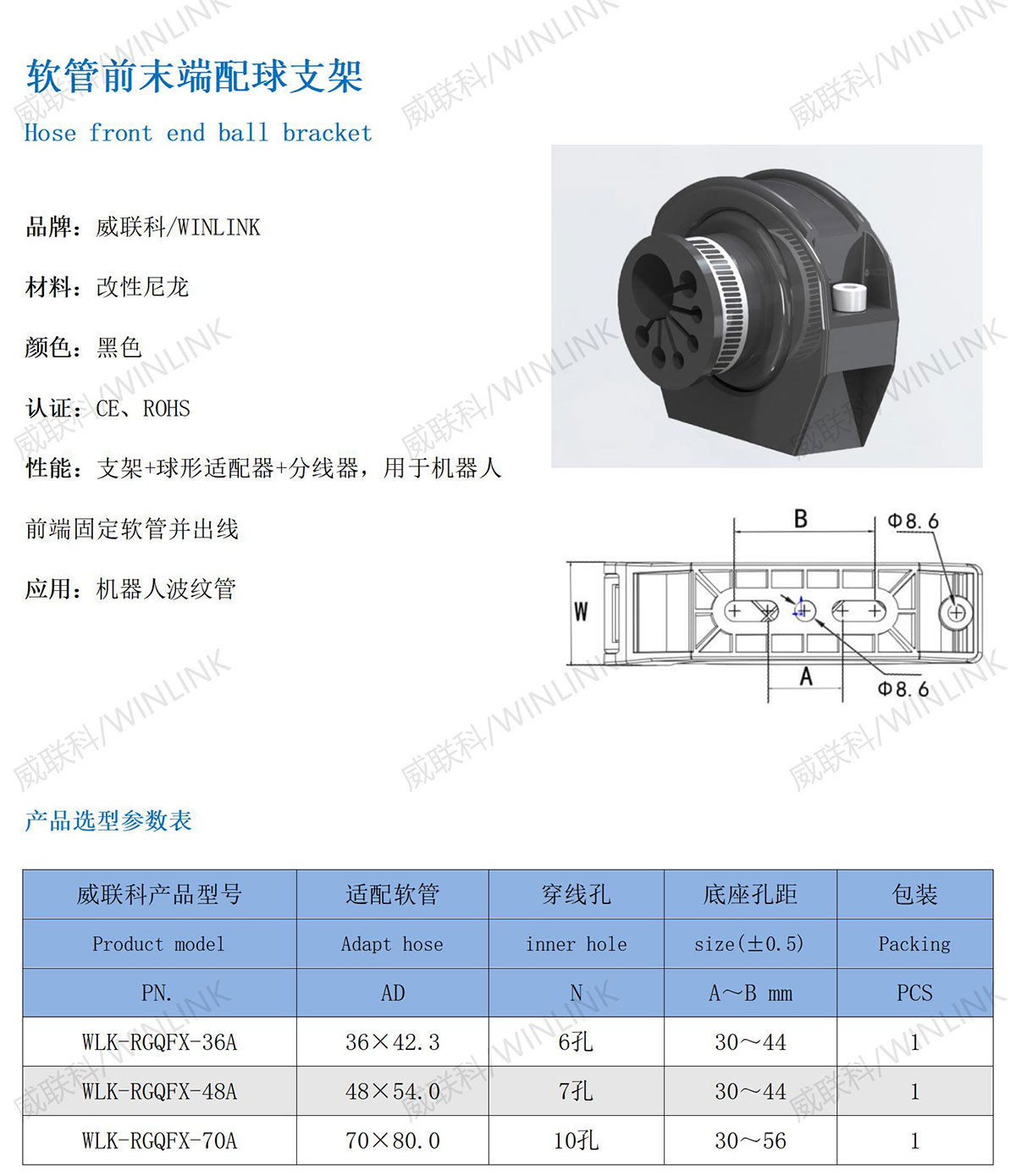 性能:支架+球形适配器+分线器,用于机器人前端固定软管并出线
