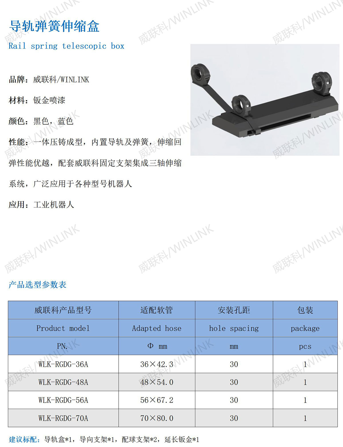 性能:一体压铸成型,内置导轨及弹簧,伸缩回弹性能优越,配套威联科固定支架集成三轴伸缩系统,广泛应用于各种型号机器人