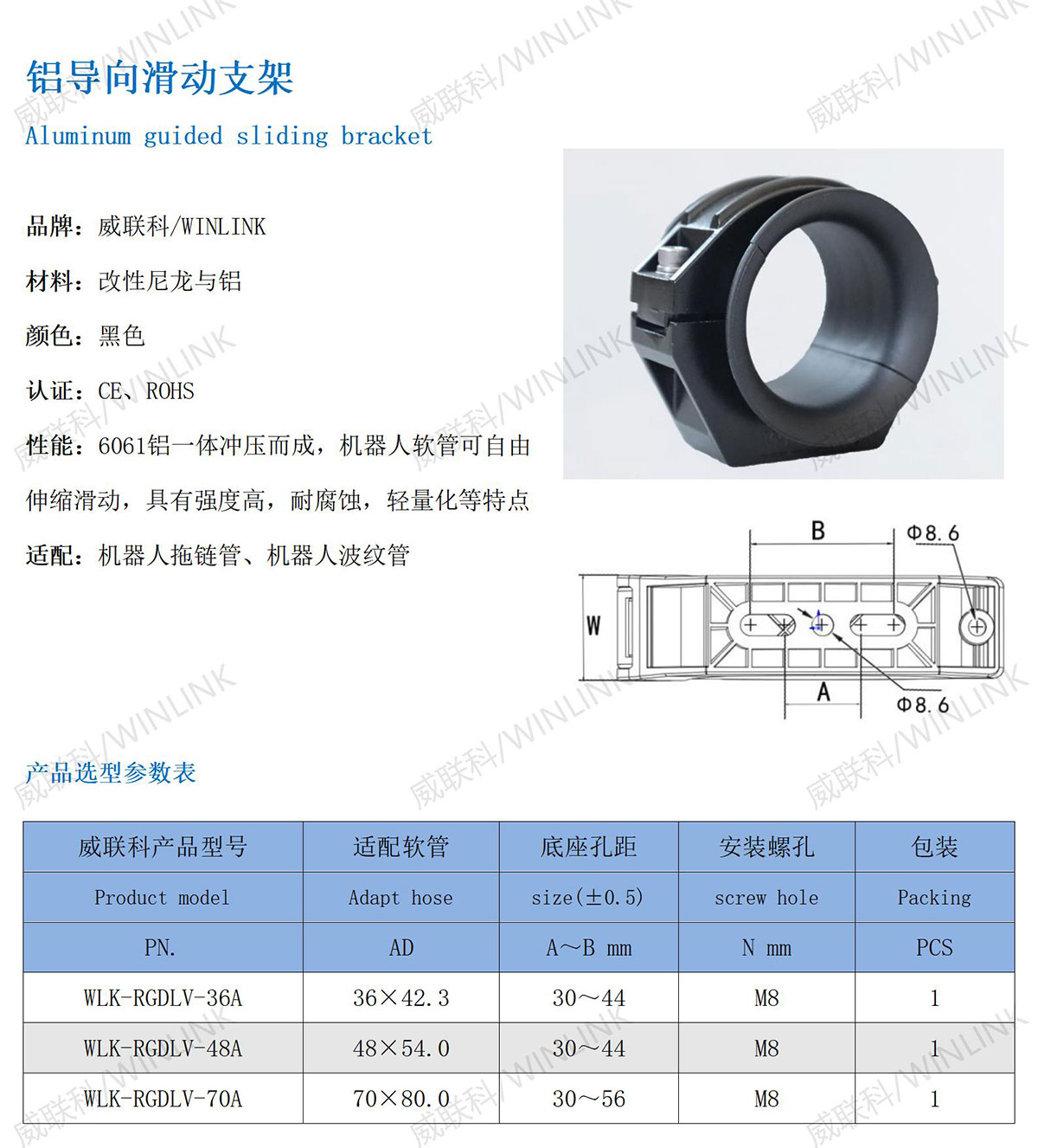 品牌:威联科/WINLINK 材料:改性尼龙与铝 颜色:黑色 认证:CE、ROHS 性能:6061铝一体冲压而成,机器人软管可自由伸缩滑动,具有强度高,耐腐蚀,轻量化等特点 适配:机器人拖链管、机器人波纹管