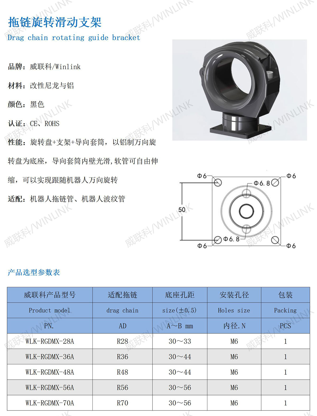 品牌:威联科/Winlink 材料:改性尼龙与铝 颜色:黑色 认证:CE、ROHS 性能:旋转盘+支架+导向套筒,以铝制万向旋转盘为底座,导向套筒内壁光滑,软管可自由伸缩,可以实现跟随机器人万向旋转 适配:机器人拖链管、机器人波纹管