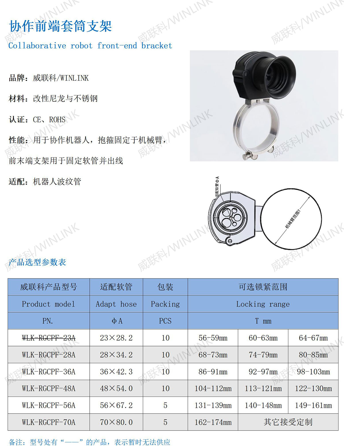 性能:用于协作机器人,抱箍固定于机械臂,前末端支架用于固定软管并出线