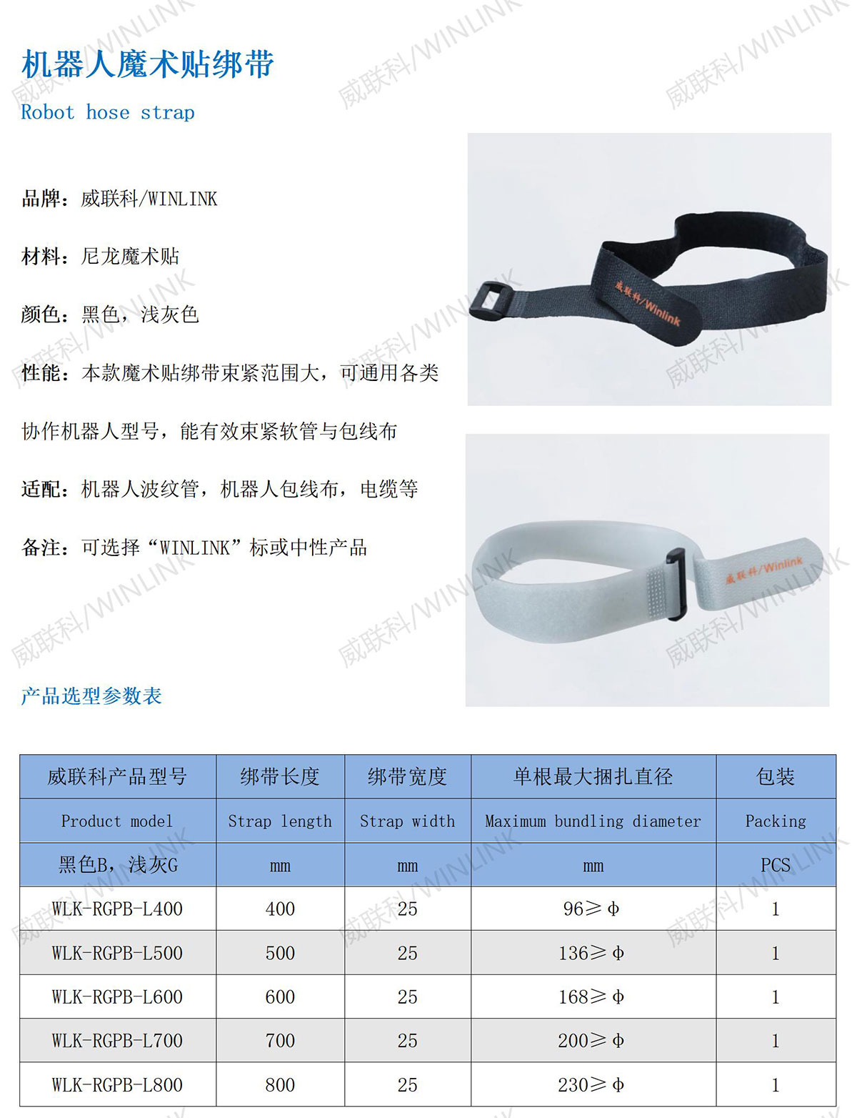 品牌:威联科/WINLINK 材料:尼龙魔术贴 颜色:黑色,浅灰色 性能:本款魔术贴绑带束紧范围大,可通用各类协作机器人型号,能有效束紧软管与包线布 适配:机器人波纹管,机器人包线布,电缆等 备注:可选择“WINLINK”标或中性产品