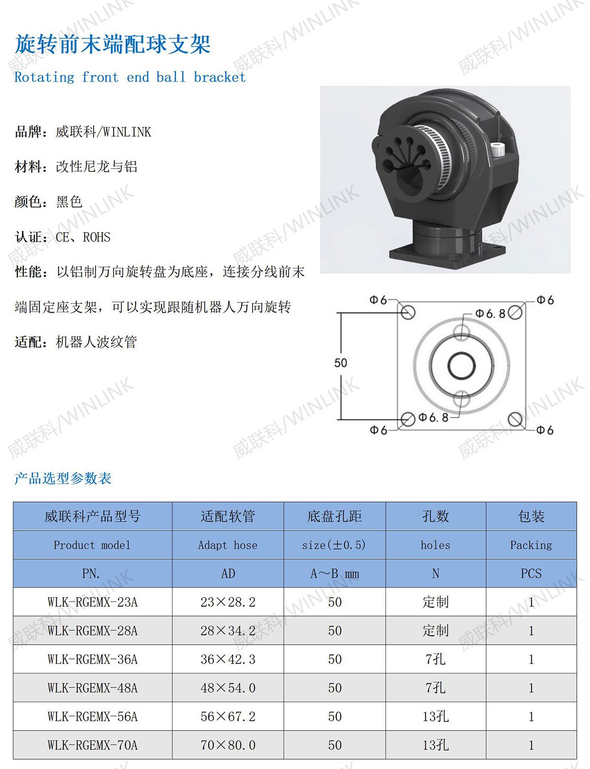 性能:以铝制万向旋转盘为底座,连接分线前末端固定座支架,可以实现跟随机器人万向旋转