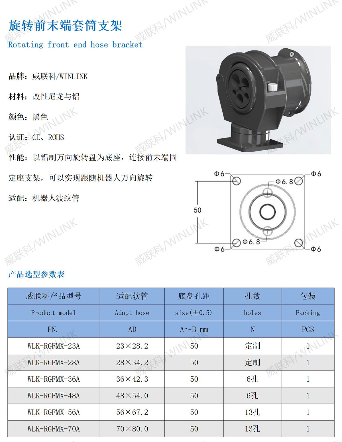 性能:以铝制万向旋转盘为底座,连接前末端固定座支架,可以实现跟随机器人万向旋转