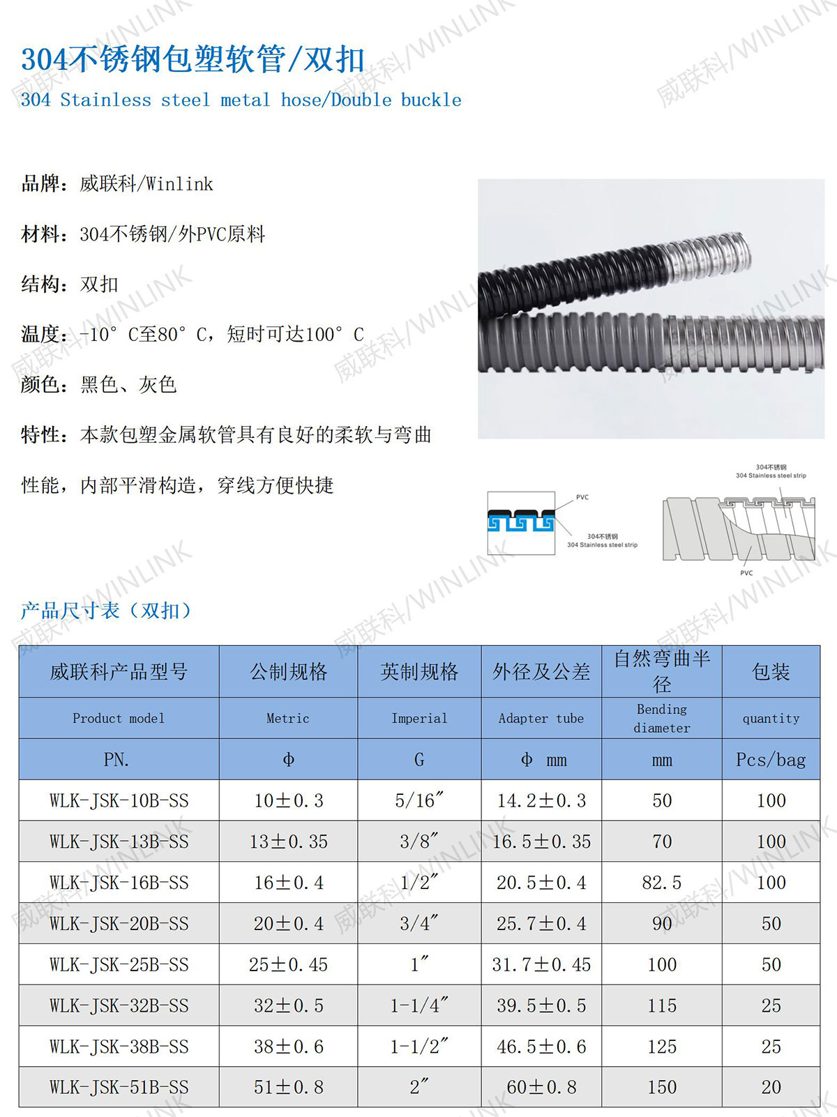 品牌:威联科/Winlink 材料:304不锈钢/外PVC原料 结构:双扣 温度:-10°C至80°C,短时可达100°C 颜色:黑色、灰色 特性:本款包塑金属软管具有良好的柔软与弯曲性能,内部平滑构造,穿线方便快捷