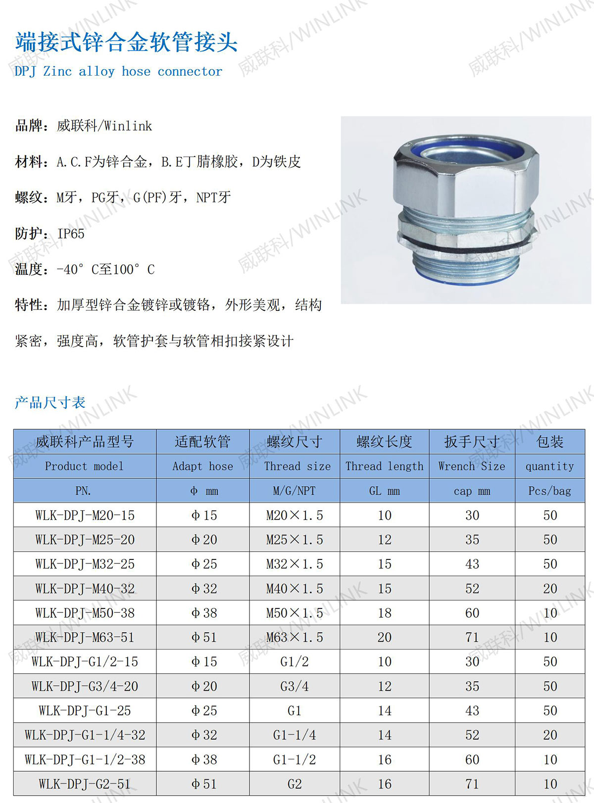 品牌:威联科/Winlink 材料:A.C.F为锌合金,B.E丁腈橡胶,D为铁皮 螺纹:M牙,PG牙,G(PF)牙,NPT牙 防护:IP65 温度:-40°C至100°C 特性:加厚型锌合金镀锌或镀铬,外形美观,结构紧密,强度高,软管护套与软管相扣接紧设计