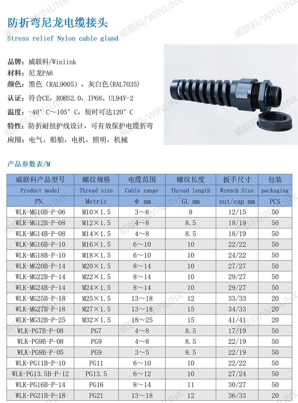品牌:威联科/Winlink 材料:尼龙PA6 颜色:黑色(RAL9005),灰白色(RAL7035) 认证:符合CE,ROHS2.0,IP68、UL94V-2 温度:-40°C~105°C,短时可达120°C 特性:防折耐扭护线设计,可有效保护电缆折弯 应用:电气,船舶,电机,照明,机械