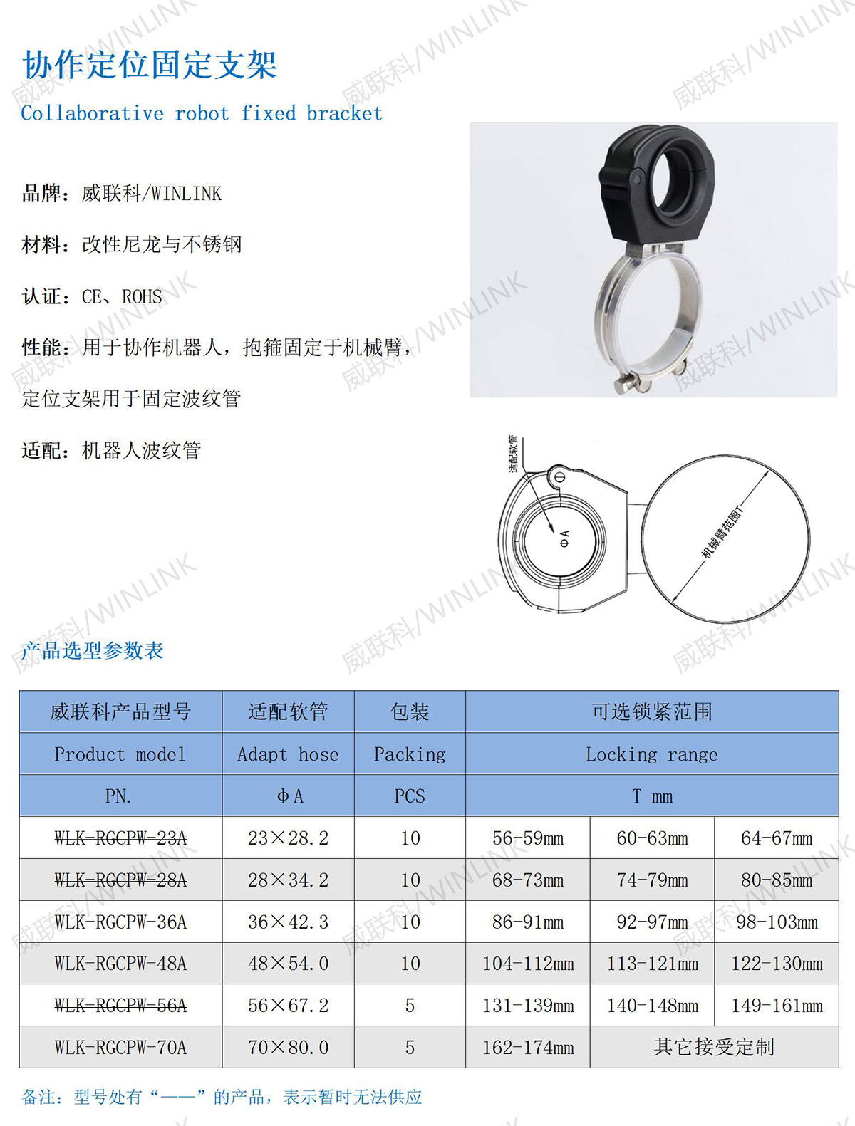 性能:用于协作机器人,抱箍固定于机械臂,定位支架用于固定波纹管