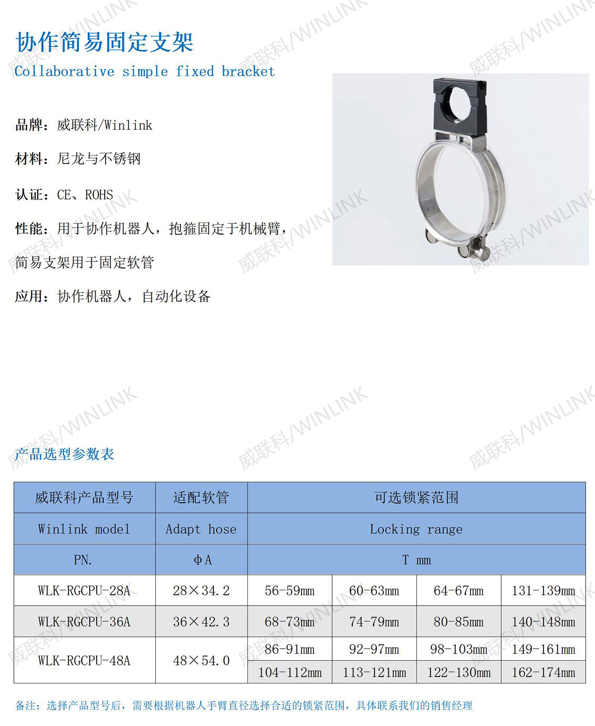 性能:用于协作机器人,抱箍固定于机械臂,简易支架用于固定软管