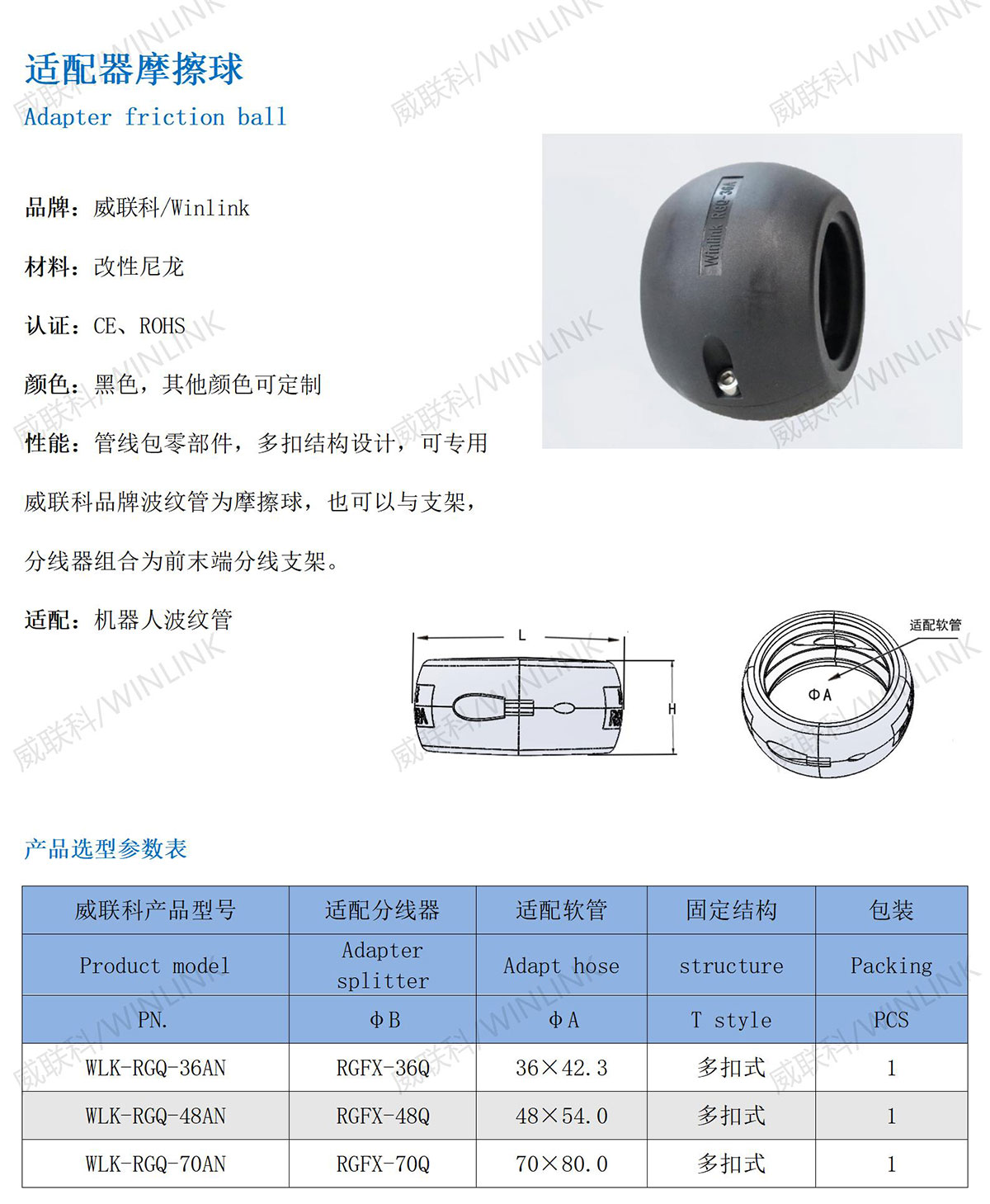 品牌:威联科/Winlink 材料:改性尼龙 认证:CE、ROHS 颜色:黑色,其他颜色可定制 性能:管线包零部件,多扣结构设计,可专用威联科品牌波纹管为摩擦球,也可以与支架,分线器组合为前末端分线支架。 适配:机器人波纹管