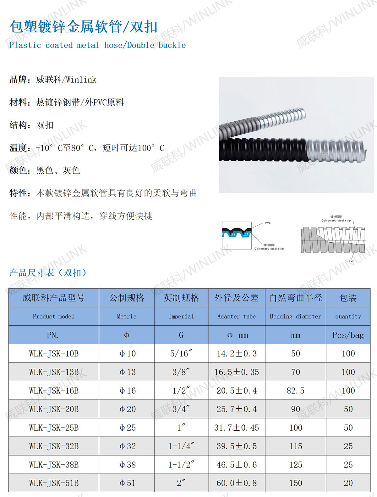 品牌:威联科/Winlink 材料:热镀锌钢带/外PVC原料 结构:双扣 温度:-10°C至80°C,短时可达100°C 颜色:黑色、灰色 特性:本款镀锌金属软管具有良好的柔软与弯曲 性能,内部平滑构造,穿线方便快捷