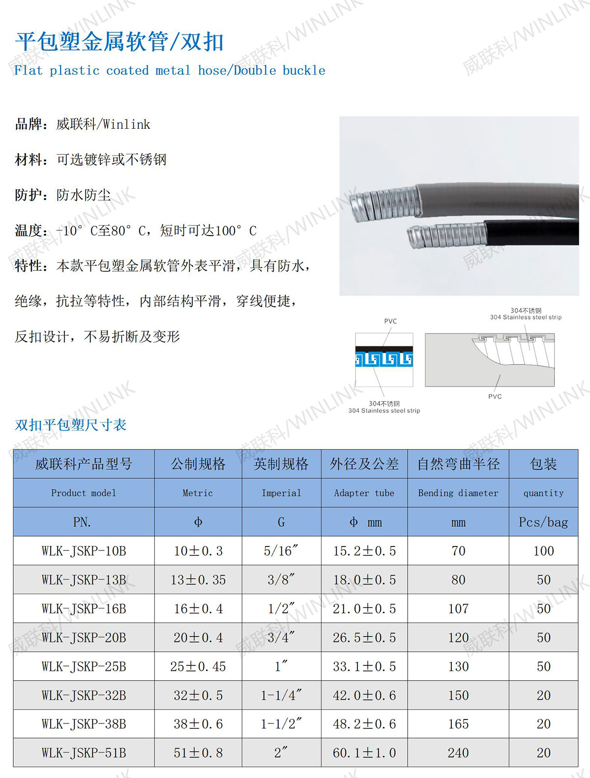品牌:威联科/Winlink 材料:可选镀锌或不锈钢 防护:防水防尘 温度:-10°C至80°C,短时可达100°C 特性:本款平包塑金属软管外表平滑,具有防水,绝缘,抗拉等特性,内部结构平滑,穿线便捷,反扣设计,不易折断及变形