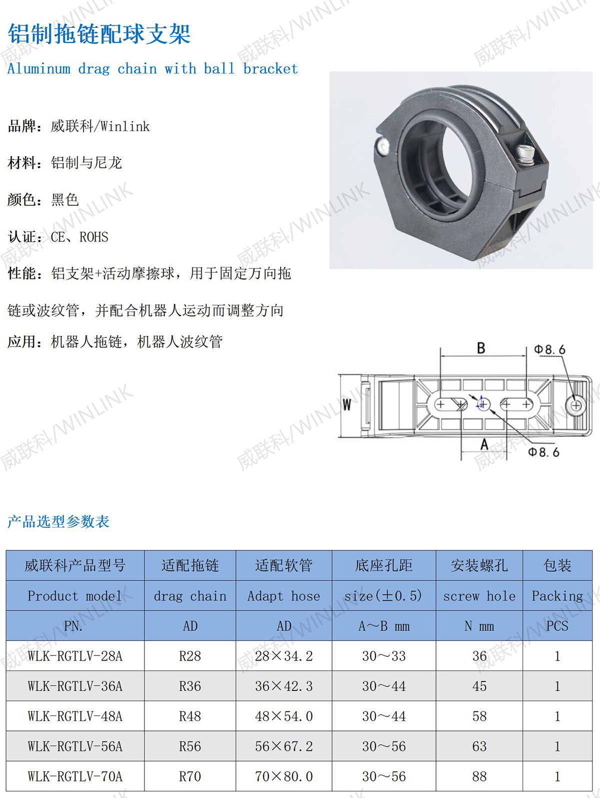 性能:铝支架+活动摩擦球,用于固定万向拖链或波纹管,并配合机器人运动而做出方向调整